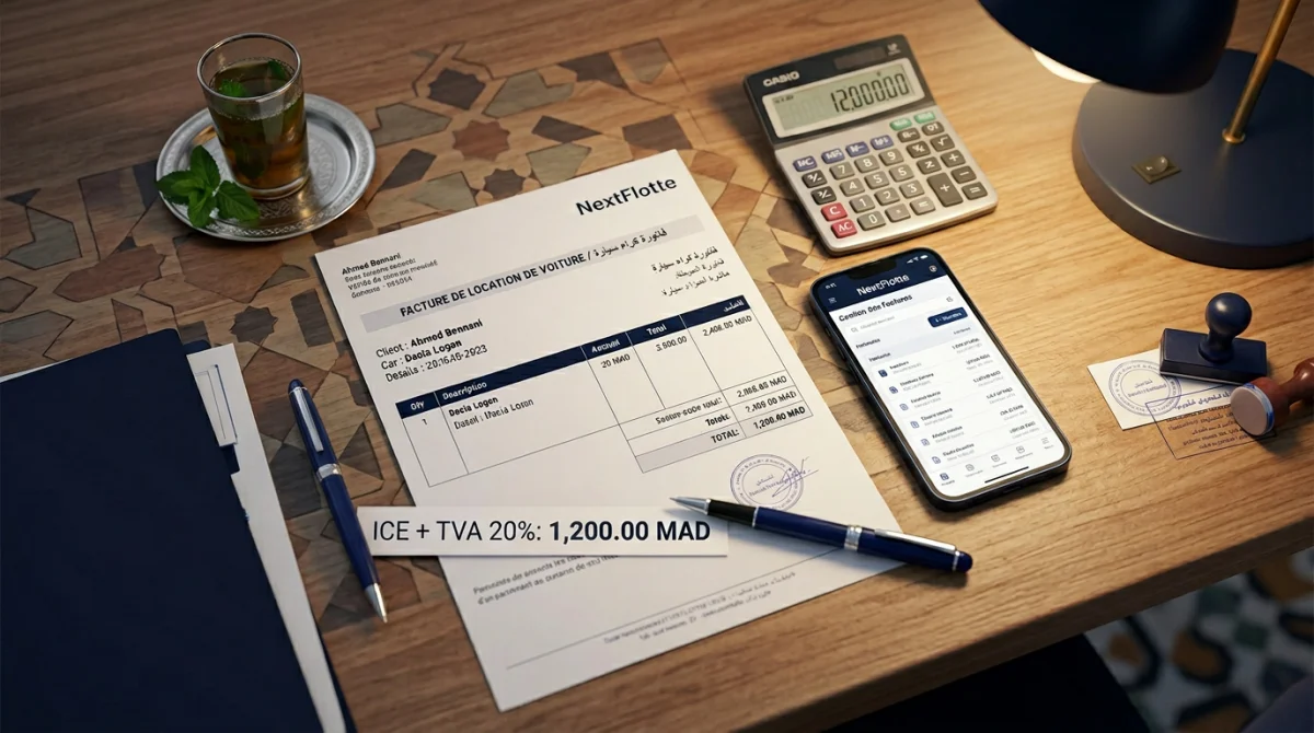 الحل الآلي (NextFlotte كمثال): توليد الفاتورة بـ ICE، TVA 20%، و numérotation chronologique تلقائية، بالإضافة لـ export DGI JSON لنظام e-facture الجديد.