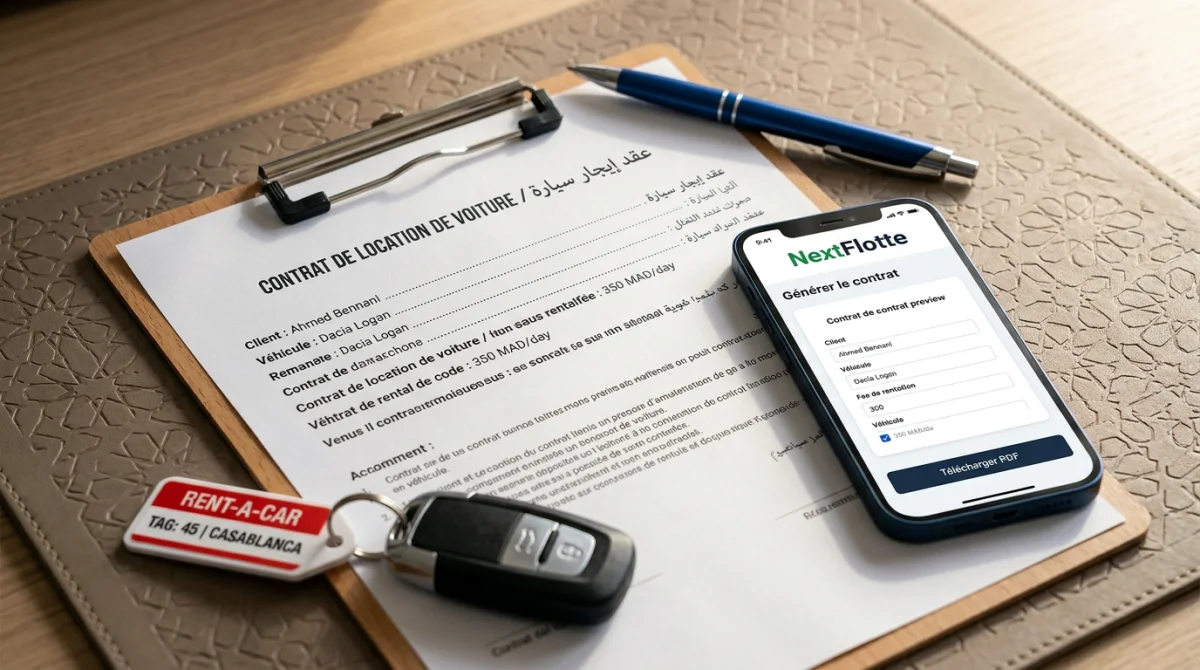 العقد القانوني ليس رفاهية، بل هو الدرع القانوني للوكالة أمام المحكمة وشركة التأمين. الفقرات الـ 11 الإلزامية + état des lieux المُصوّر + التوقيع على iPad توفر حماية كاملة. حمّل نموذج PDF مجاناً، أو جرب NextFlotte 7 أيام لتوليد العقود تلقائياً في أقل من دقيقة.